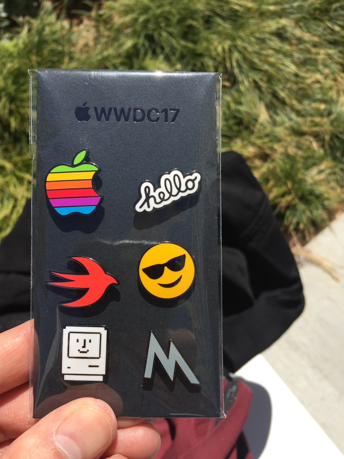 Idag är det söndag och dagen innan WWDC 2017 startar. Jag började dagen med att hämta ut konferenspasset och allt runt omkring. Brickan i år är tråkigare än förra året. Förra året var det swiftkod igår bara namnet. Däremot gillar jag det övriga bättre i år. Jackan som vi fick är som en jeansjacka med en diskret WWDC text. På köptes blev det även pins med lite olika häftiga Apple ikoner.